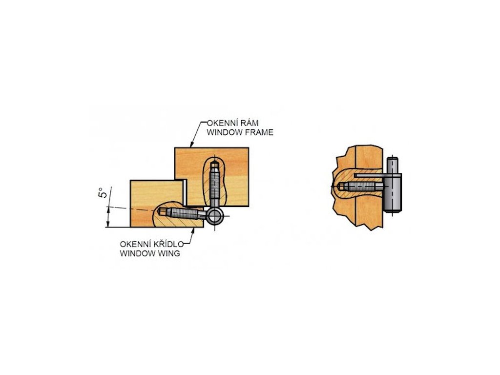 Zawias do wkręcenia w ramę okienną i skrzydło, z luźno osadzonym trzpieniem; gwóźdź zapobiega obracaniu się zawiasu. Na zamówienie możemy wykonać ozdobne metalowe osłony na zawiasy.