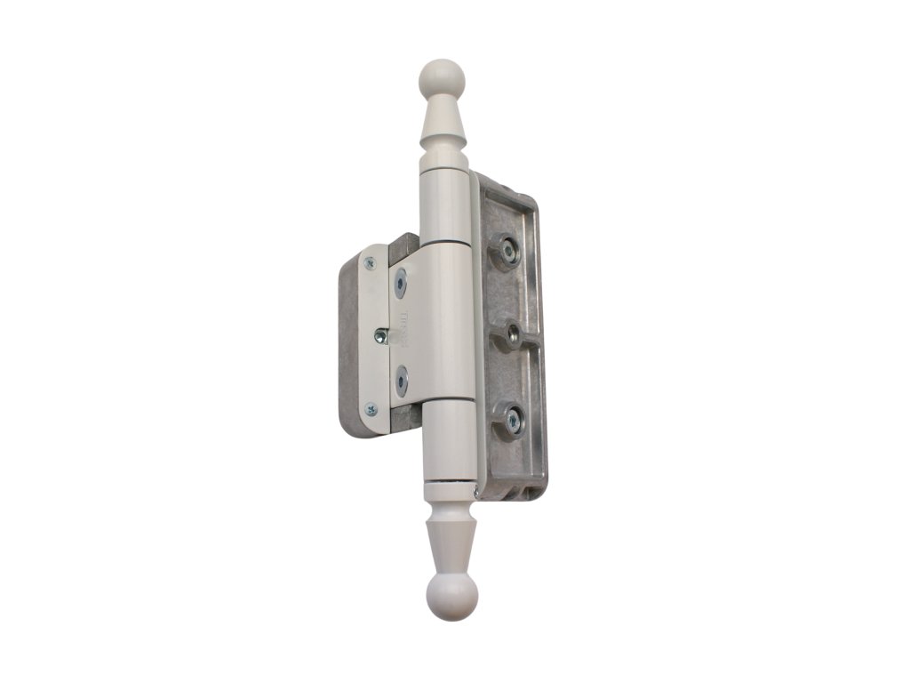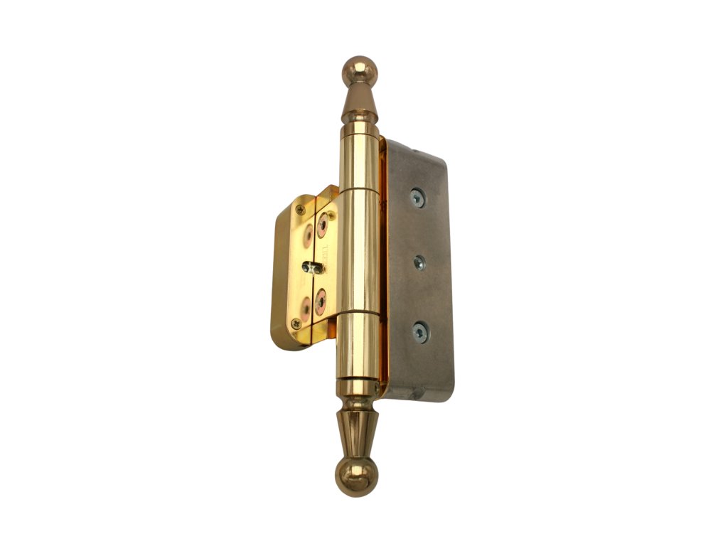 Elegantní závěs s ozdobným ukončením čepu zvláště vhodný pro historické a stylové objekty. Je určen pro vchodové dveře s polodrážkou 15 - 18 mm, ideální pro profil EURO 68. (pro dveřní profil - zakování dveřní frézou) Závěs je seřiditelný ve třech směrech, vysoce kvalitní (byl testován na 1 milion cyklů). Je vyroben v bezpečnostním provedení proti vysazení dveří - čep je zajištěn zajišťovacím šroubem.